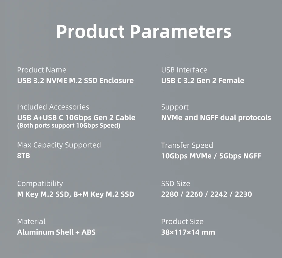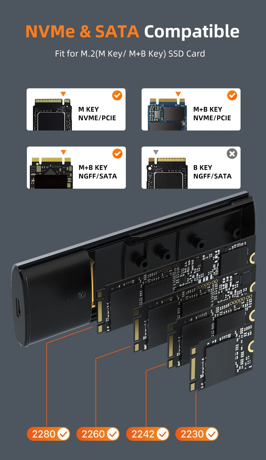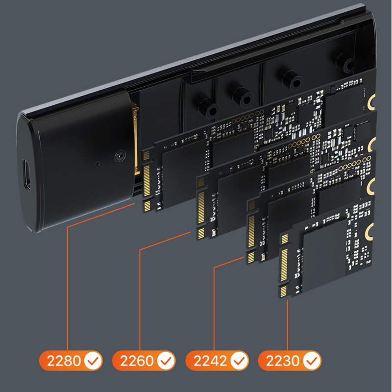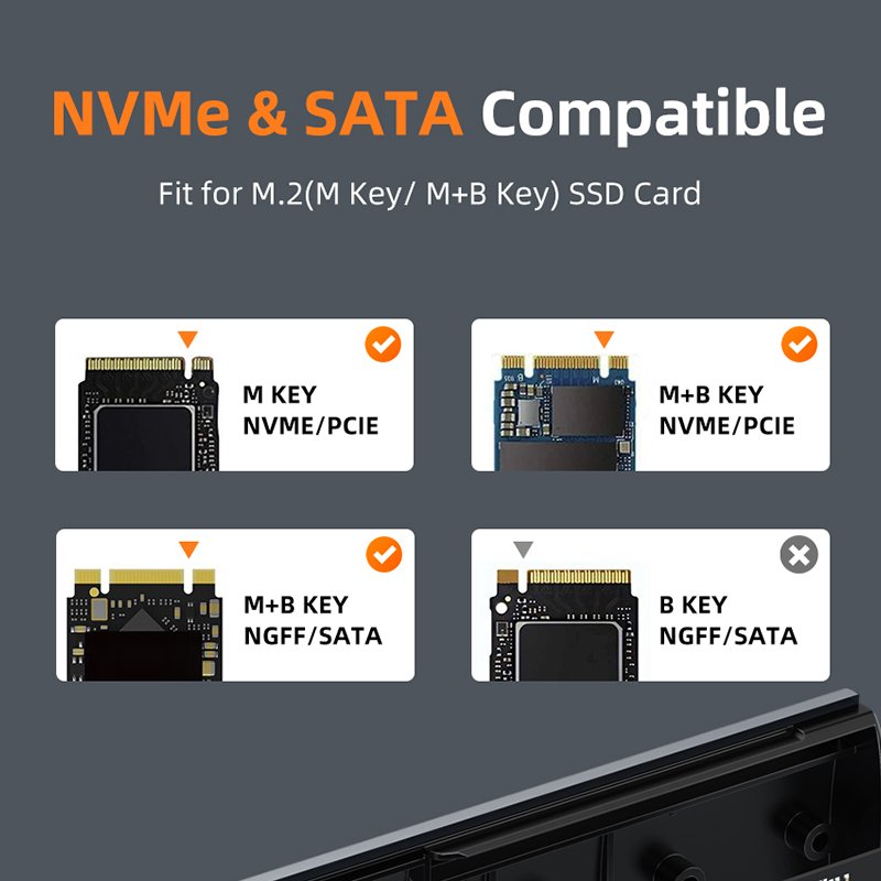 The M.2 NVMe SATA SSD enclosure is compatible with M Key or B+M Key 2TB capacity and 2230 /2242 /2260 /2280 SSDs above 2TB. and supports multiple operating systems such as Windows, Mac OS, Linux, Android.