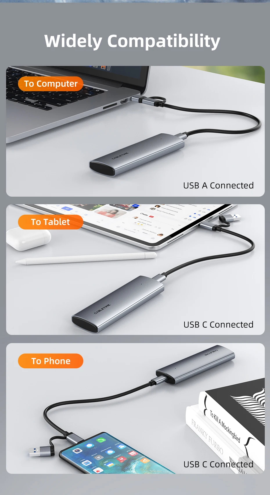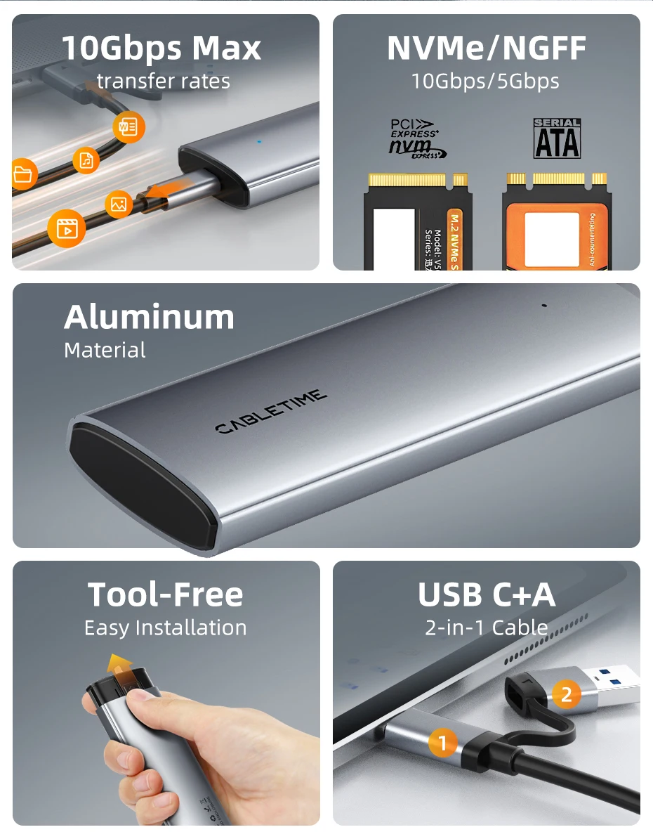 CABLETIME CB32G 10Gbps USB C to NVMe & SATA M.2 SSD Enclosure