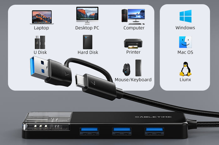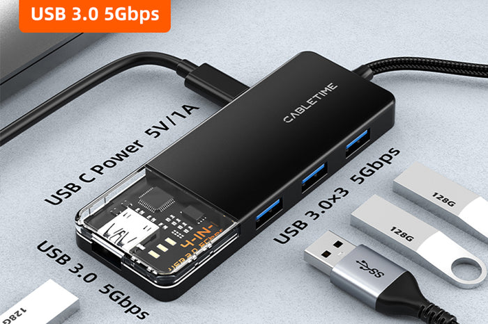 CABLETIME 4-in-1 USB A+C to USB 3.0 hub offers four USB 3.0 ports, meeting most of your connectivity needs, such as flash drive, keyboard, mouse, card reader, printer, camera, USB fan, etc. Delivers 5Gbps data transfer, 10x faster than USB 2.0, allowing you to transfer files and sync your devices quickly and efficiently. Enjoy a data transfer experience that is as fast as it is smooth!