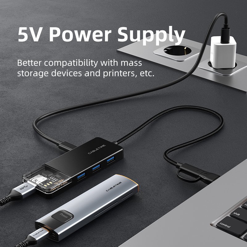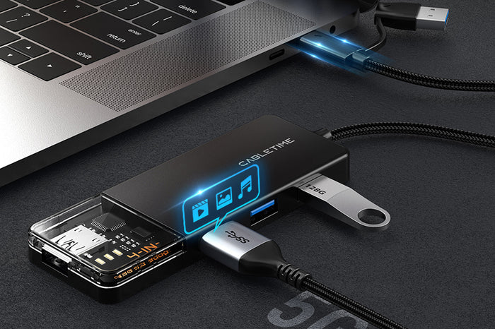 CABLETIME 4-in-1 USB A+C to USB 3.0 hub offers four USB 3.0 ports, meeting most of your connectivity needs, such as flash drive, keyboard, mouse, card reader, printer, camera, USB fan, etc. Delivers 5Gbps data transfer, 10x faster than USB 2.0, allowing you to transfer files and sync your devices quickly and efficiently. Enjoy a data transfer experience that is as fast as it is smooth!