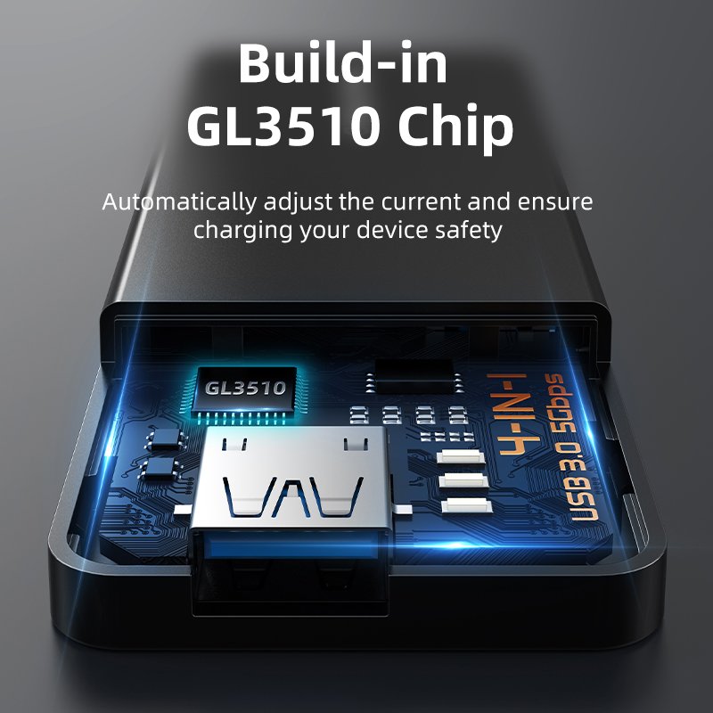 Equipped with a high-performance GL3510 chip, the USB Type C to 4 Port USB 3.0 Hub ensures efficient data processing and high-speed transfer. With a 5V power supply, the USB A and type C to USB 3.0 hub provides reliable and stable power even when connected to mass storage or printers, preventing dropouts and maintaining performance.