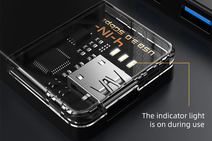 USB C to USB 3.0 Hub features a crystal-clear shell design that can appreciate the GL3510 chip with technology aesthetics. The Icon engraved design adds a touch of elegance that perfectly complements your devices. The indicator light glows during use. Enhance your workspace or home office with USB 3.0 hub that not only performs well but also looks great!