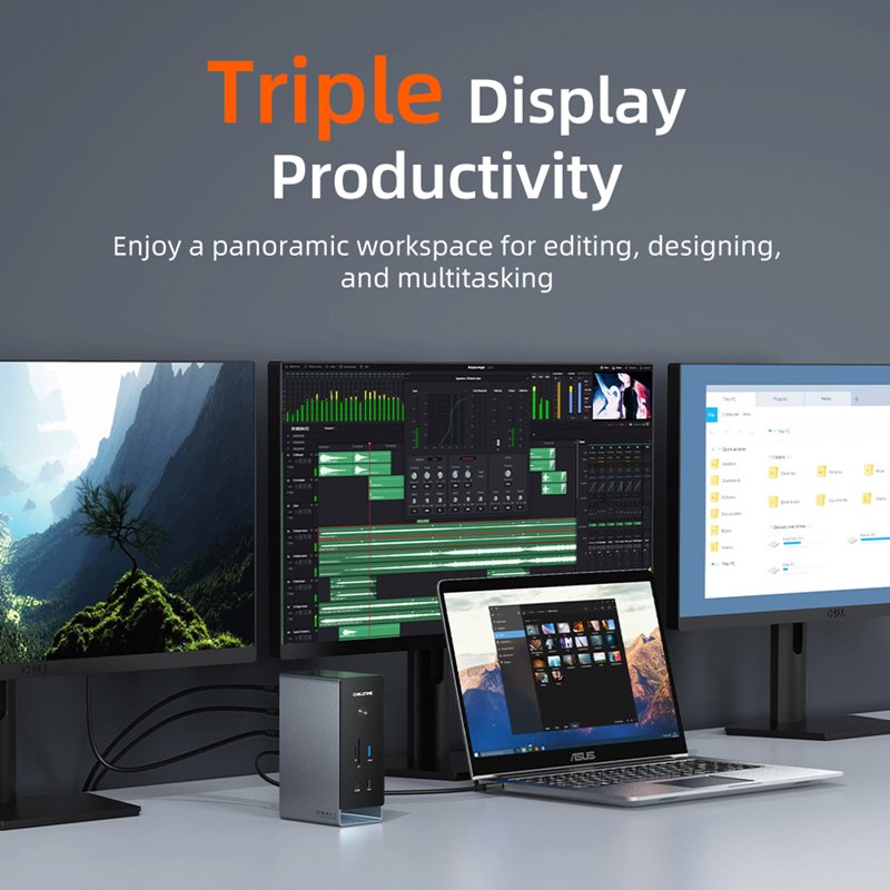 Extend your workspace across up to three external monitors with stunning clarity. This USB-C docking station features two HDMI ports (one supporting 4K@60Hz, one at 4K@30Hz) and one DisplayPort at 4K@60Hz, allowing flexible setups for multitasking, creative work, and immersive productivity. Ideal for video editors, designers, and professionals running Windows MST-enabled laptops. (MacOS doesn’t support MST)