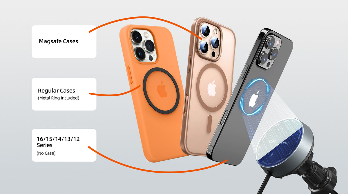Charge your phone with blazing 15W wireless speed—perfectly optimized for iPhone 16/15 and all Qi-compatible devices. Whether you use a MagSafe case, a regular one, or none at all, the included metal ring ensures a strong magnetic connection. This car magnetic wireless charger adapts to your setup, giving you fast power and a secure hold, no matter the brand or case style.