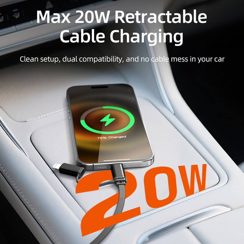 Enjoy clean, high-speed charging without the cable clutter. The built-in retractable cable delivers up to 20W of fast charging via USB-C and Lightning connectors, making it perfect for iPhones, Androids, and tablets. Whether you’re the driver or passenger, simply pull, plug, and power up—then retract it back for a tidy, organized car interior.
