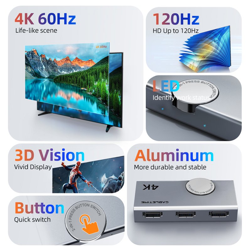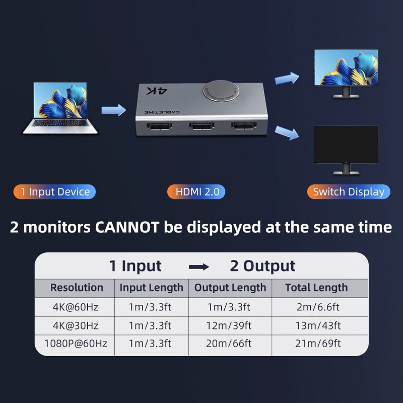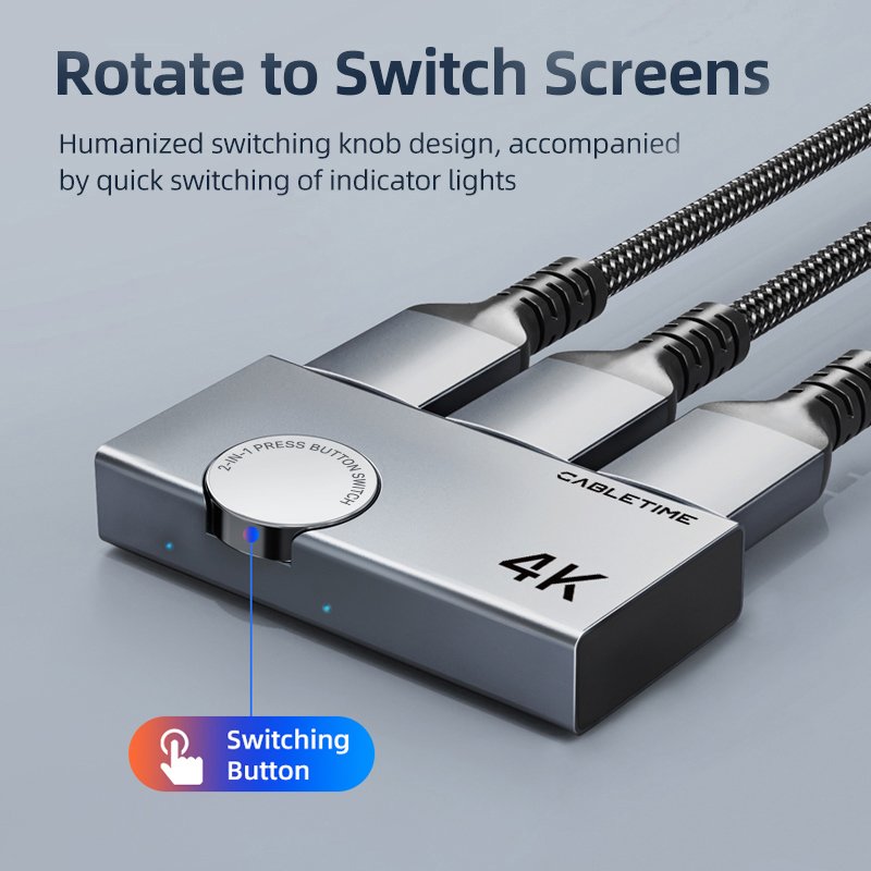 CABLETIME Bidirectional has three HDMI ports. It can work in two modes. 2 in 1 out mode: connect two HDMI sources to a single HDMI display, quick switch by knob without changing cable 1 in 2 out mode, connect one HDMI source to two displays (please note, only one display can work at a time). HDMI switcher is compatible with a wide range of devices, including game consoles, Blu-ray players, laptops, PCs, and more.