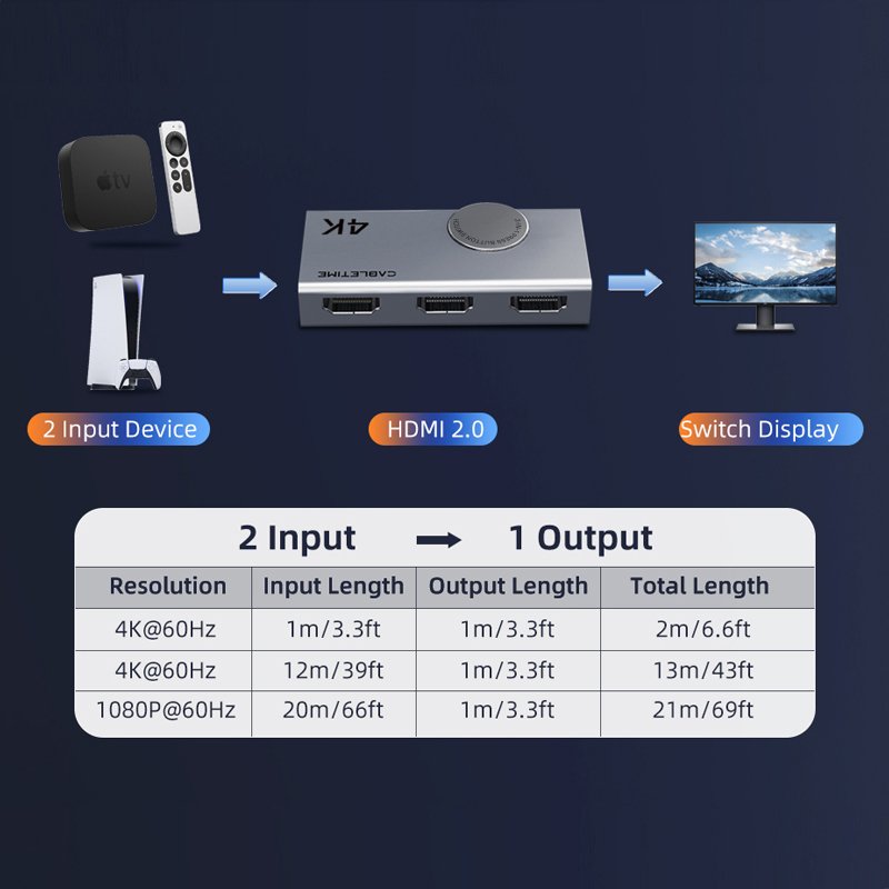 CABLETIME CP37G 2-in-1 HDMI 2.0 4K 60Hz Bi-Direction Switcher