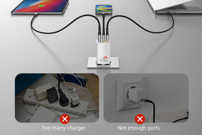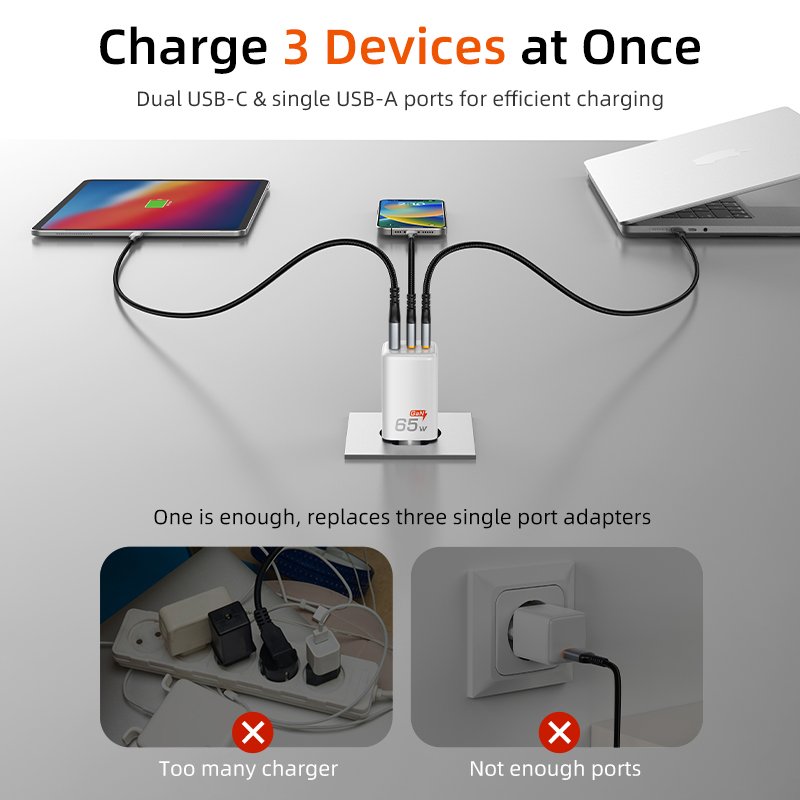 The 65W charger provides flexible power distribution across single, dual, and three-port charging, adapting to your devices’ needs.