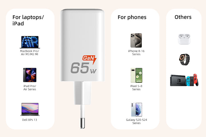 Charge all your devices with a single 65W portable GaN charger. From powerful laptops like MacBook Pro and Dell XPS to tablets, smartphones (iPhone 8–16, Galaxy S20–S24), and accessories like AirPods and Nintendo Switch—this charger handles it all. With PD 3.0 fast charging, it delivers efficient power for every device, simplifying your charging setup.
