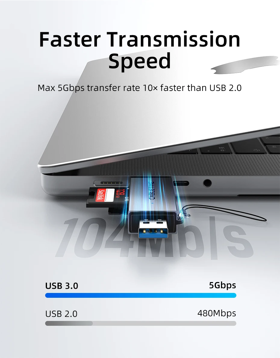 Move files between your SD cards and devices like MacBook Pro, Android phone, and iPad at speeds up to 104 MB/s. Our USB C sd card reader adapter, equipped with the advanced GL3235 chip, easily supporting up to 2TB of data. It’s designed for efficient, high-capacity data handling.